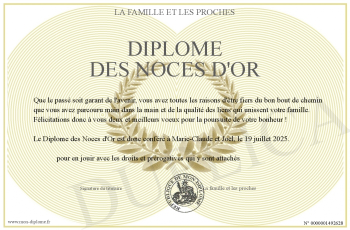 Envoyez par email votre Diplôme des Noces d'Or personalisé