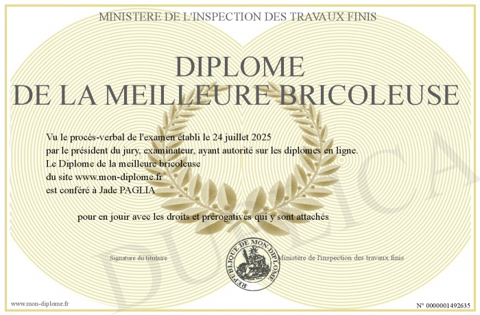 Envoyez par email votre Diplôme de la meilleure bricoleuse personalisé