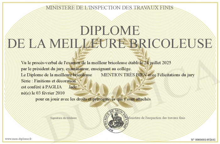 Envoyez par email votre Diplôme de la meilleure bricoleuse personalisé