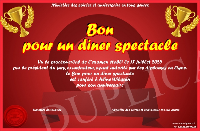 Envoyez par email votre Bon pour un diner spectacle personalisé