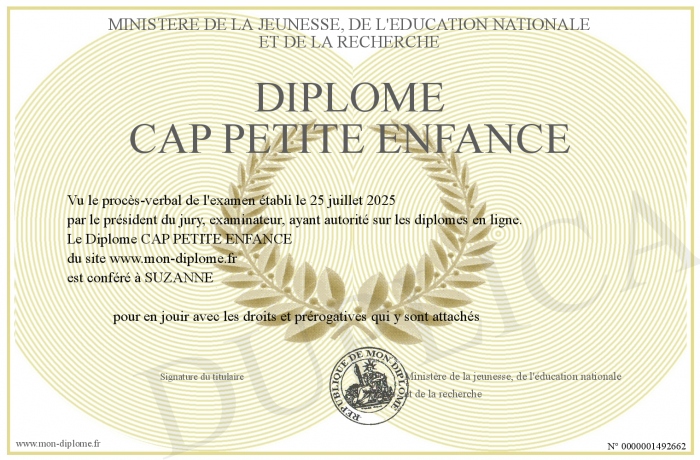 Envoyez par email votre Diplôme CAP PETITE ENFANCE personalisé