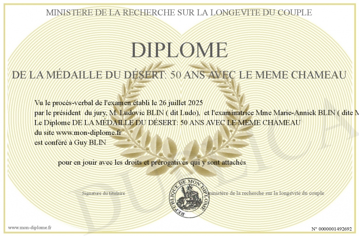 Envoyez par email votre Diplôme DE LA MÉDAILLE DU DÉSERT: 50 ANS AVEC LE MEME CHAMEAU personalisé