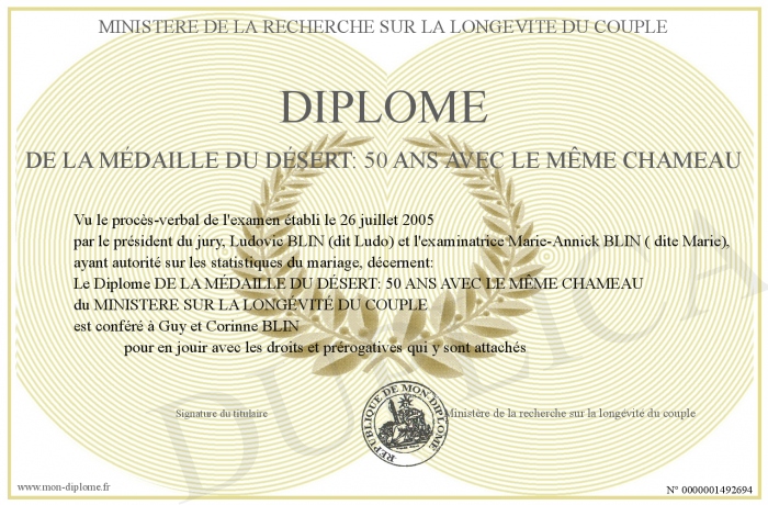 Envoyez par email votre Diplôme DE LA MÉDAILLE DU DÉSERT: 50 ANS AVEC LE MÊME CHAMEAU personalisé