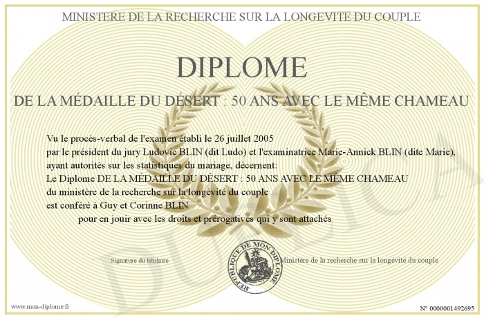 Envoyez par email votre Diplôme DE LA MÉDAILLE DU DÉSERT : 50 ANS AVEC LE MÊME CHAMEAU personalisé