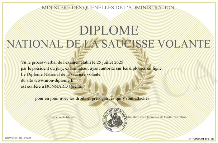Envoyez par email votre Diplôme National de la saucisse volante personalisé