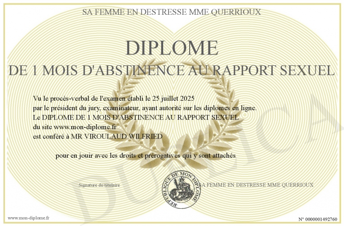 Envoyez par email votre DIPLOME DE 1 MOIS D'ABSTINENCE AU RAPPORT SEXUEL personalisé