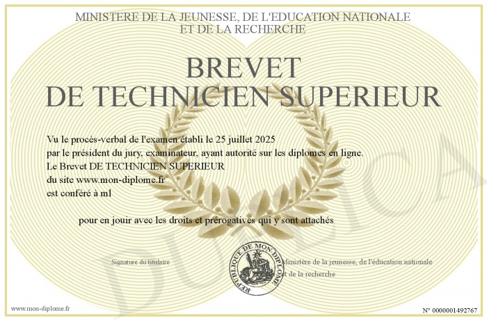Envoyez par email votre Brevet DE TECHNICIEN SUPERIEUR personalisé