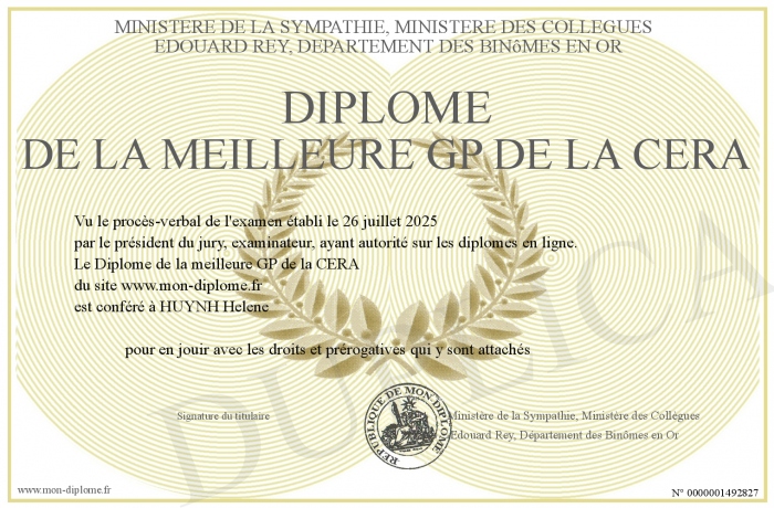 Envoyez par email votre Diplôme de la meilleure GP de la CERA personalisé
