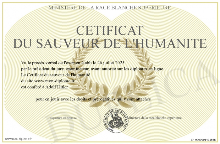 Envoyez par email votre Cetificat du sauveur de l'humanité personalisé