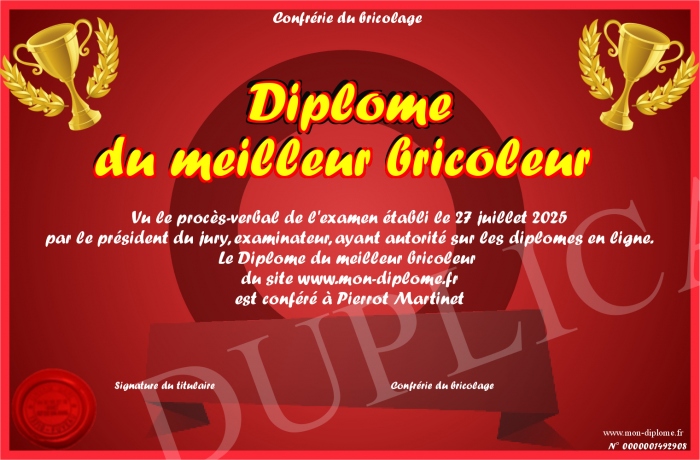 Envoyez par email votre Diplôme du meilleur bricoleur personalisé