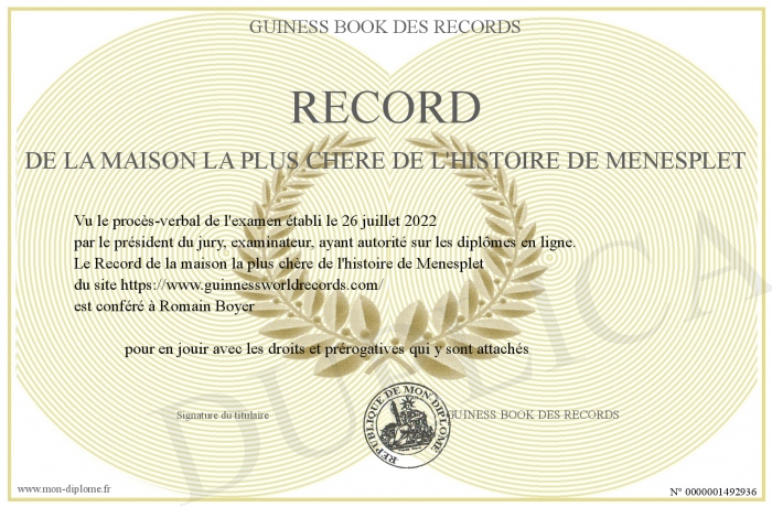 Envoyez par email votre Record de la maison la plus chère de l'histoire de Menesplet personalisé