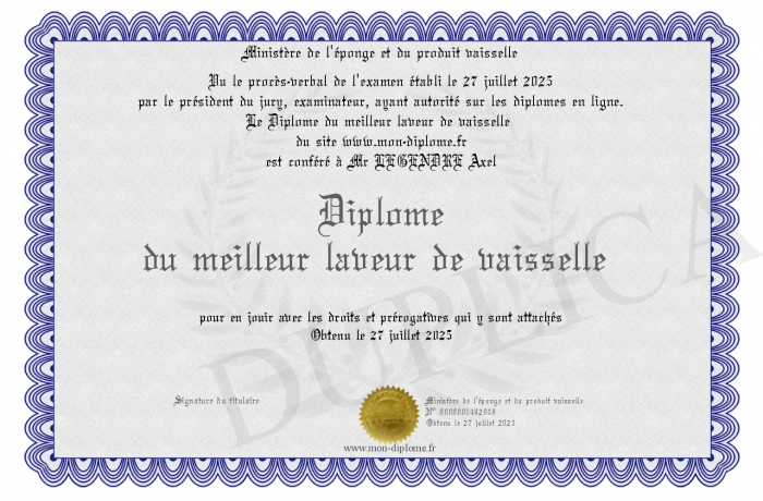 Envoyez par email votre Diplôme du meilleur laveur de vaisselle personalisé