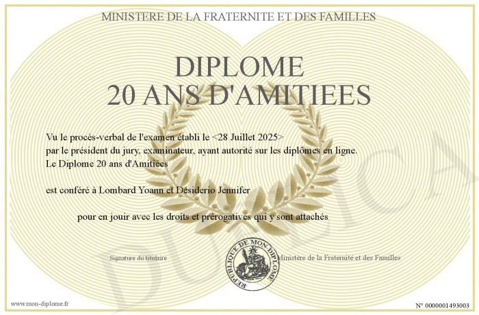 Envoyez par email votre Diplôme 20 ans d'Amitiées personalisé