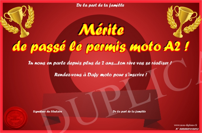 Envoyez par email votre Mérite de passé le permis moto A2 ! personalisé