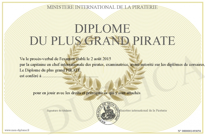 Envoyez par email votre Diplôme du plus grand PIRATE personalisé