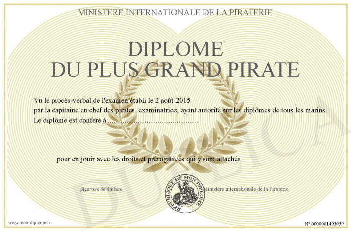Envoyez par email votre Diplôme du plus grand PIRATE personalisé