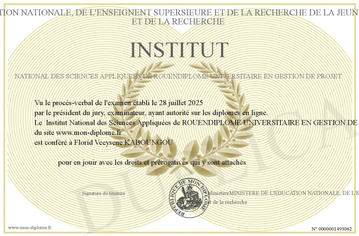 Envoyez par email votre Institut National des Sciences Appliquées de ROUENDIPLOME UNIVERSITAIRE EN GESTION DE PROJET personalisé