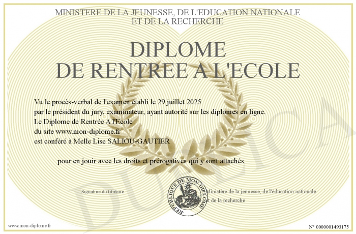 Envoyez par email votre Diplome de Rentrée A l'Ecole personalisé