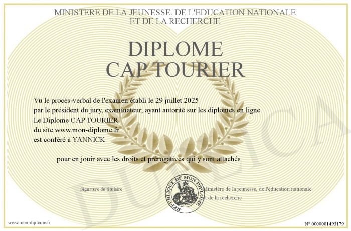 Envoyez par email votre Diplôme CAP TOURIER personalisé
