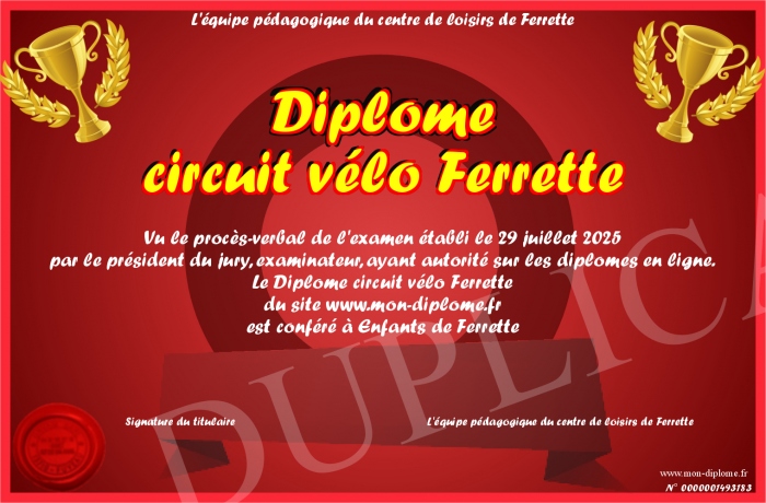 Envoyez par email votre Diplome circuit vélo Ferrette personalisé