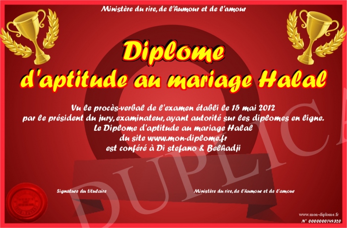 Envoyez par email votre Diplome d'aptitude au mariage Halal personalisé