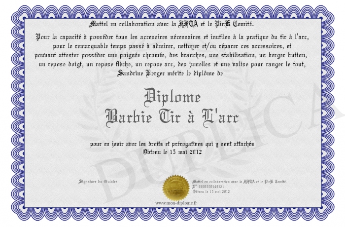 Envoyez par email votre Diplôme Barbie Tir à L'arc personalisé