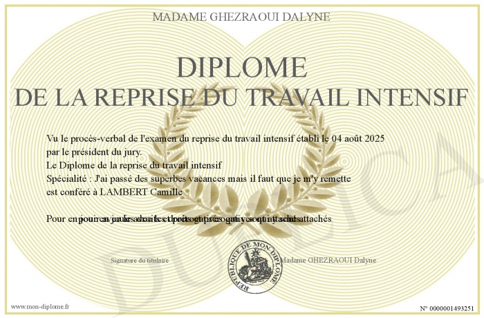 Envoyez par email votre Diplôme de la reprise du travail intensif personalisé
