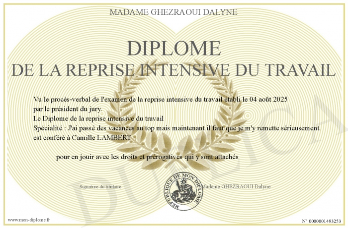 Envoyez par email votre Diplôme de la reprise intensive du travail personalisé
