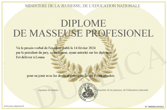 Envoyez par email votre Diplôme de masseuse profesionel personalisé