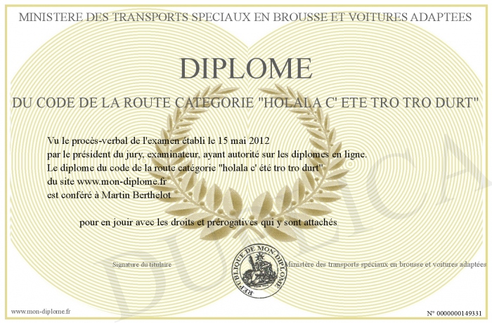 Envoyez par email votre diplôme du code de la route catégorie -holala c' été trô trô durt- personalisé