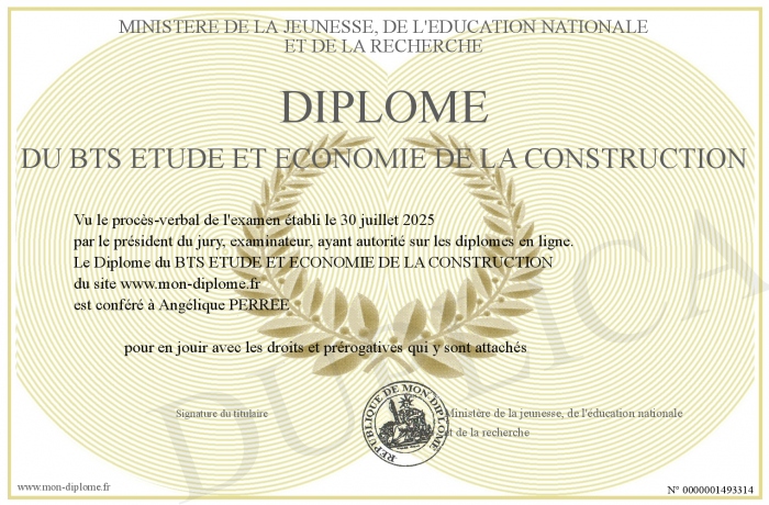 Envoyez par email votre Diplôme du BTS ETUDE ET ECONOMIE DE LA CONSTRUCTION personalisé