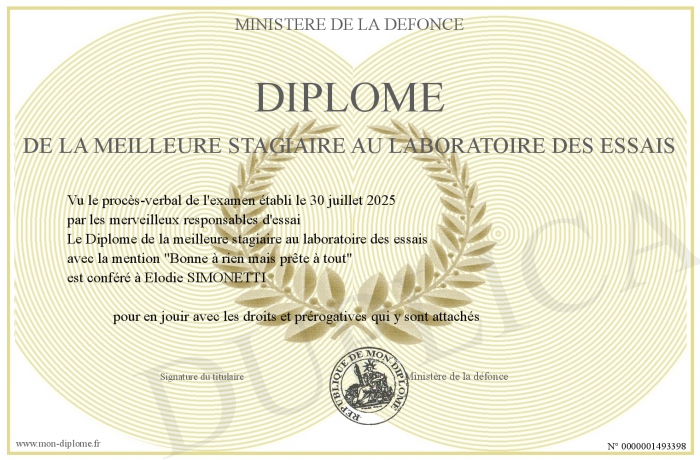 Envoyez par email votre Diplôme de la meilleure stagiaire au laboratoire des essais personalisé