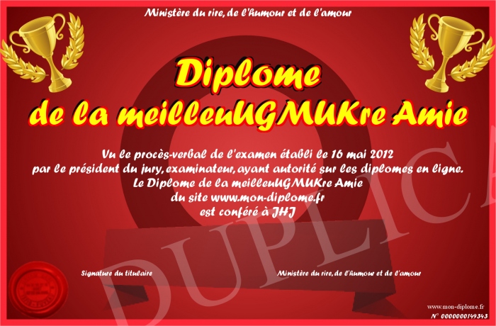 Envoyez par email votre Diplome de la meilleuUGMUKre Amie personalisé