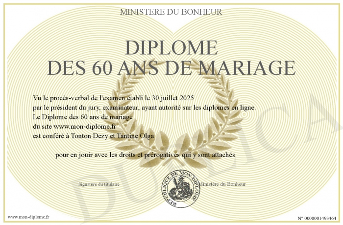 Envoyez par email votre Diplôme des 60 ans de mariage personalisé