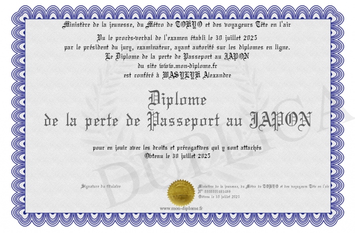 Envoyez par email votre Diplôme de la perte de Passeport au JAPON personalisé