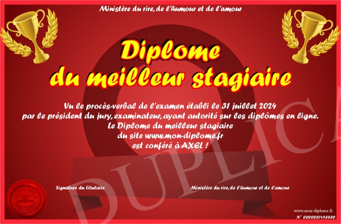Envoyez par email votre Diplome du meilleur stagiaire personalisé