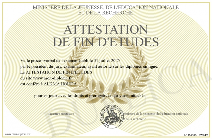 Envoyez par email votre ATTESTATION DE FIN D'ETUDES personalisé