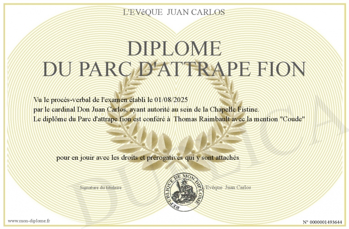 Envoyez par email votre Diplôme du Parc d'attrape fion personalisé