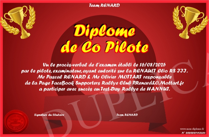 Envoyez par email votre Diplôme de Co Pilote personalisé