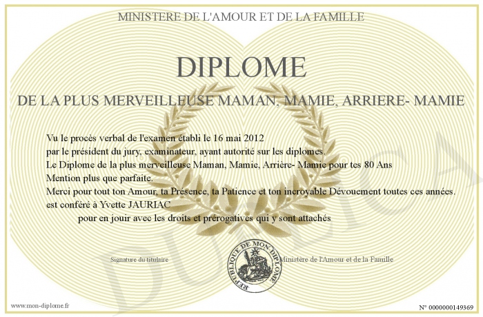 Envoyez par email votre Diplôme de la plus merveilleuse Maman, Mamie, Arrière- Mamie personalisé