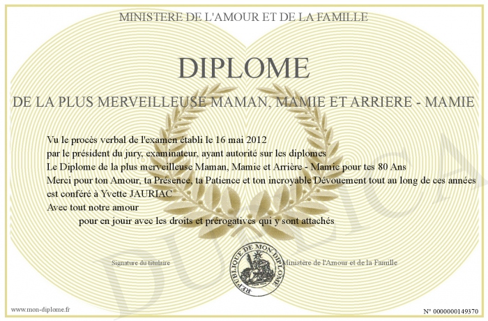 Envoyez par email votre Diplôme de la plus merveilleuse Maman, Mamie et Arrière - Mamie personalisé