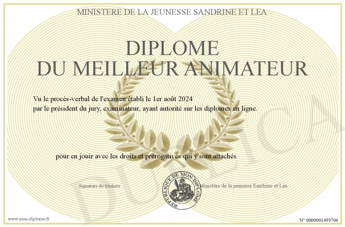 Envoyez par email votre Diplôme du meilleur animateur personalisé