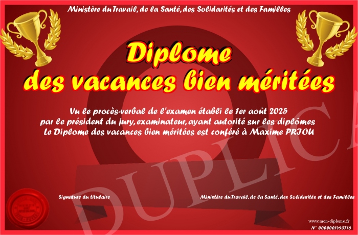 Envoyez par email votre Diplôme des vacances bien méritées personalisé