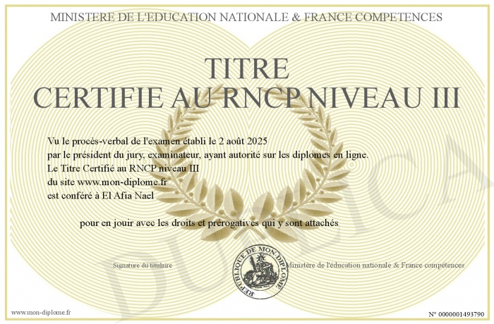 Envoyez par email votre Titre Certifié au RNCP niveau III personalisé