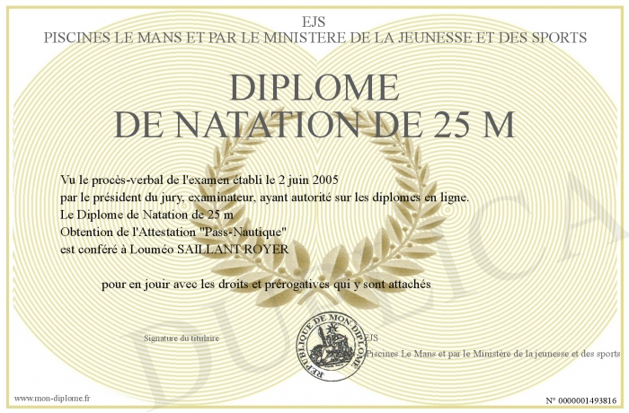 Envoyez par email votre Diplôme de Natation de 25 m personalisé