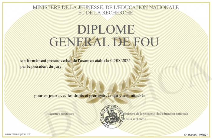 Envoyez par email votre Diplôme Général De Fou personalisé