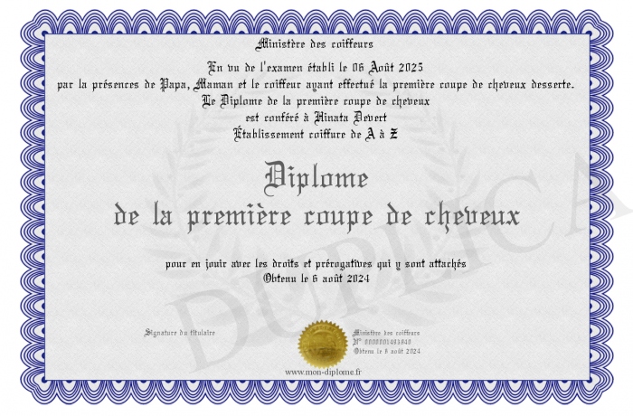 Envoyez par email votre Diplôme de la première coupe de cheveux personalisé