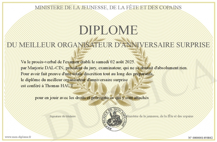 Envoyez par email votre Diplôme du MEILLEUR ORGANISATEUR D'ANNIVERSAIRE SURPRISE personalisé