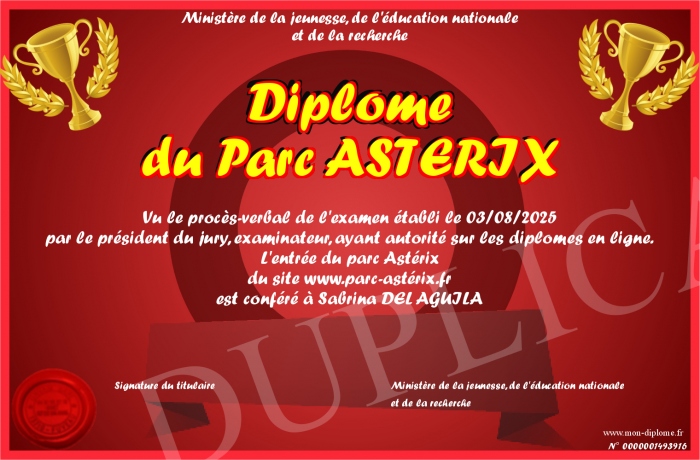 Envoyez par email votre Diplôme du Parc ASTERIX personalisé
