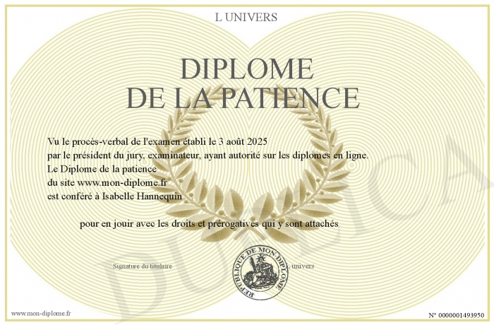 Envoyez par email votre Diplôme de la patience personalisé